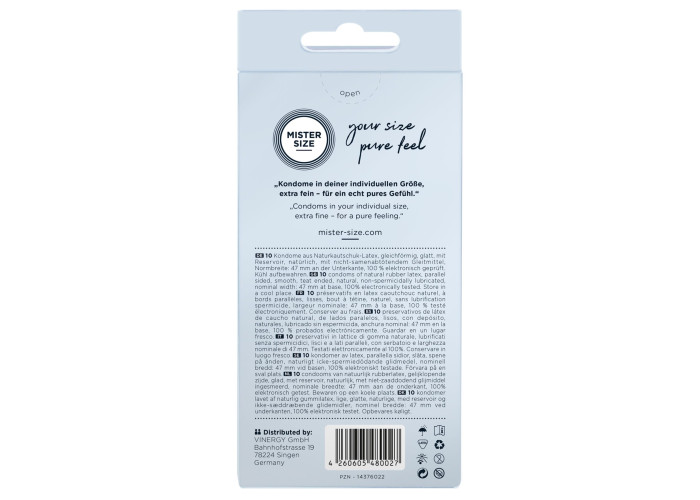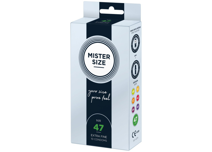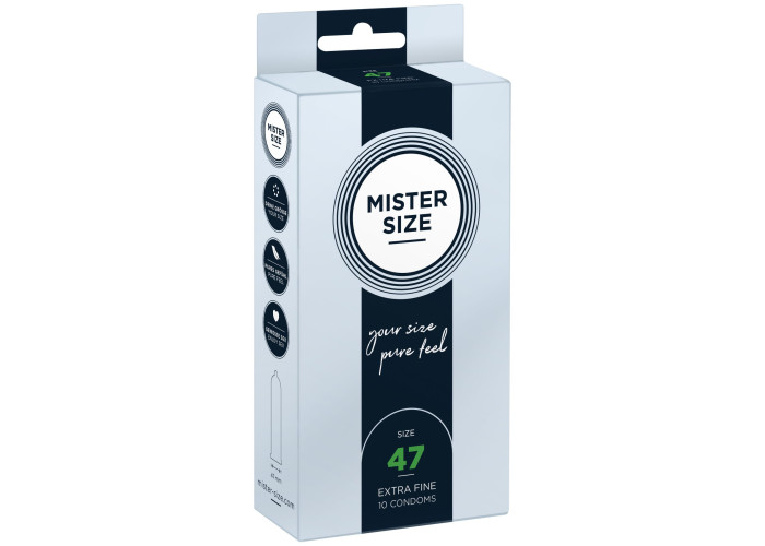 Презерватив без презерватива — лише природні відчуття під час близькості! Пропонуємо купити презервативи Mister Size - pure feel - 47, виготовлені з найтоншого каучукового латексу. Товщина стінок презерватива всього 0,05 мм, водночас він досить міцний, щоб не порватися у відповідальний момент, що забезпечує надійний захист від небажаної вагітності та ЗПСШ. Презервативи покриті силіконовою змазкою, легко надягаються та забезпечені зрозумілою ілюстрованою інструкцією. Головне, правильно дібрати розмір та насолоджуватися якісним сексом!
