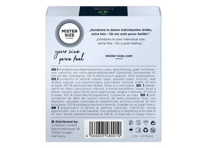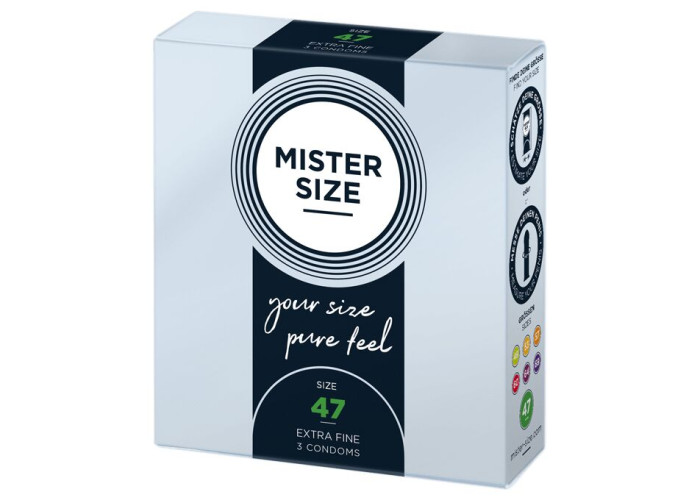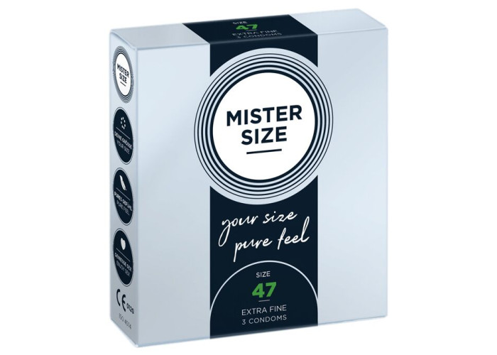 Презерватив без презерватива — лише природні відчуття під час близькості! Пропонуємо купити презервативи Mister Size - pure feel - 47, виготовлені з найтоншого каучукового латексу. Товщина стінок презерватива всього 0,05 мм, водночас він досить міцний, щоб не порватися у відповідальний момент, що забезпечує надійний захист від небажаної вагітності та ЗПСШ. Презервативи покриті силіконовою змазкою, легко надягаються та забезпечені зрозумілою ілюстрованою інструкцією. Головне, правильно дібрати розмір та насолоджуватися якісним сексом!