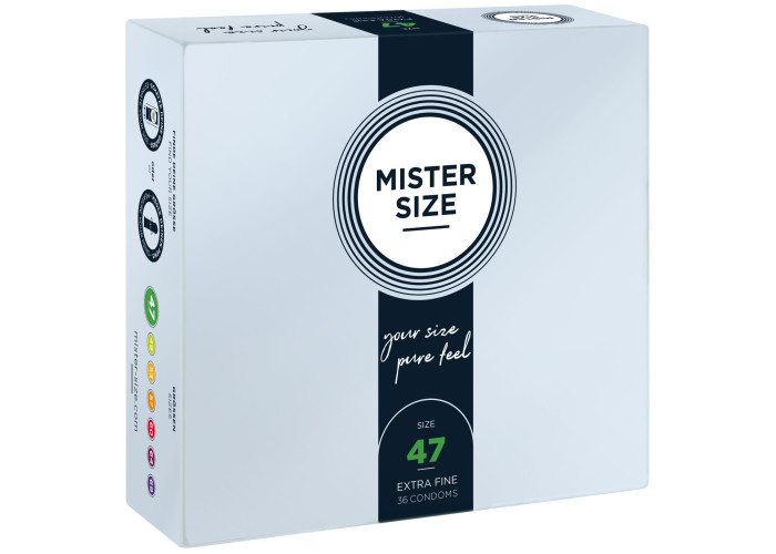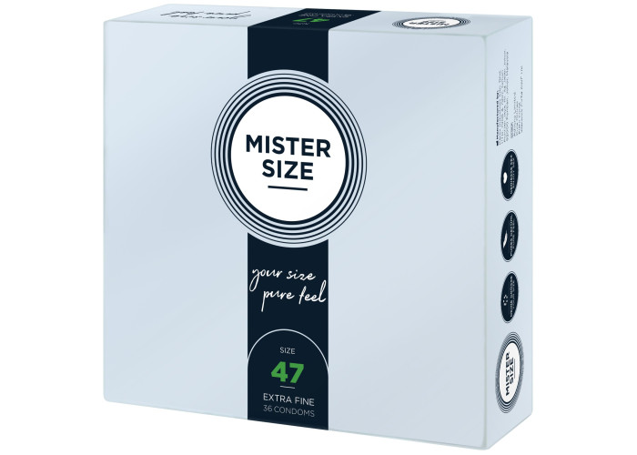 Презерватив без презерватива — лише природні відчуття під час близькості! Пропонуємо купити презервативи Mister Size - pure feel - 47, виготовлені з найтоншого каучукового латексу. Товщина стінок презерватива всього 0,05 мм, водночас він досить міцний, щоб не порватися у відповідальний момент, що забезпечує надійний захист від небажаної вагітності та ЗПСШ. Презервативи покриті силіконовою змазкою, легко надягаються та забезпечені зрозумілою ілюстрованою інструкцією. Головне, правильно дібрати розмір та насолоджуватися якісним сексом!