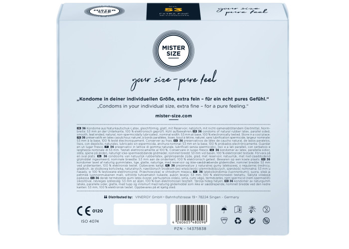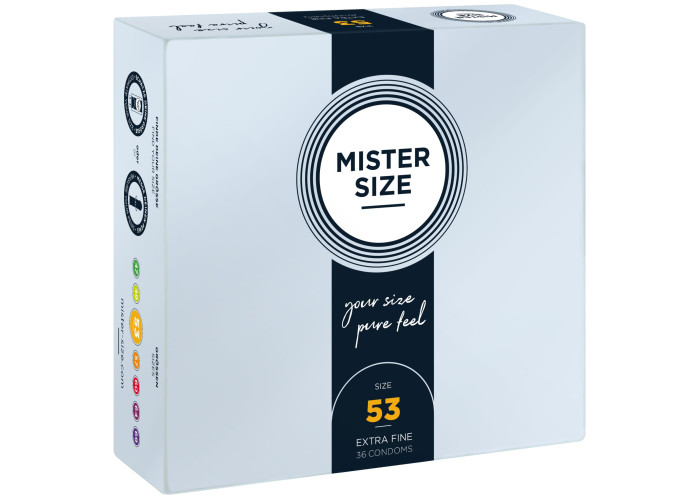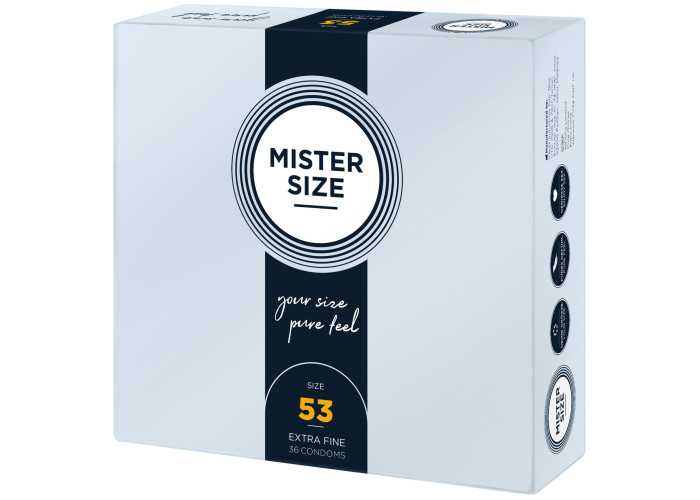 Презерватив без презерватива — лише природні відчуття під час близькості! Пропонуємо купити презервативи Mister Size - pure feel - 53, виготовлені з найтоншого каучукового латексу. Товщина стінок презерватива всього 0,05 мм, водночас він досить міцний, щоб не порватися у відповідальний момент, що забезпечує надійний захист від небажаної вагітності та ЗПСШ. Презервативи покриті силіконовою змазкою, легко надягаються та забезпечені зрозумілою ілюстрованою інструкцією. Головне, правильно дібрати розмір та насолоджуватися якісним сексом!
