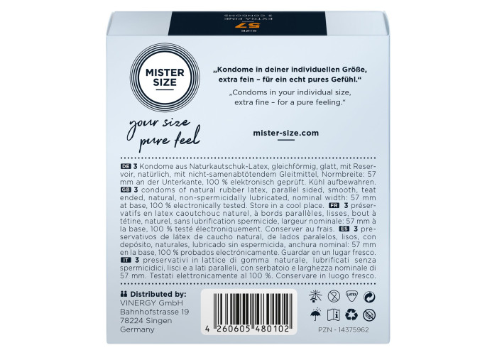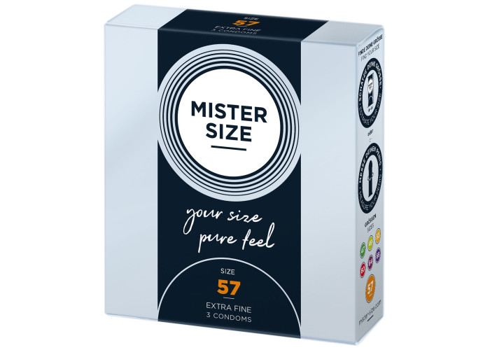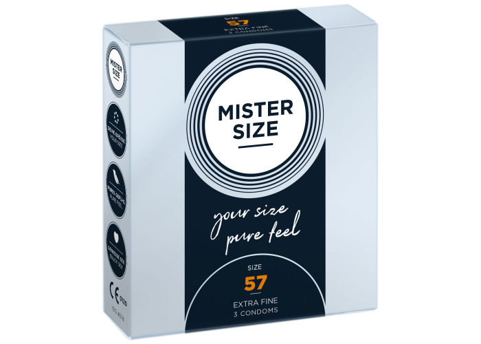 Презерватив без презерватива — лише природні відчуття під час близькості! Пропонуємо купити презервативи Mister Size - pure feel - 57, виготовлені з найтоншого каучукового латексу. Товщина стінок презерватива всього 0,05 мм, водночас він досить міцний, щоб не порватися у відповідальний момент, що забезпечує надійний захист від небажаної вагітності та ЗПСШ. Презервативи покриті силіконовою змазкою, легко надягаються та забезпечені зрозумілою ілюстрованою інструкцією. Головне, правильно дібрати розмір та насолоджуватися якісним сексом!