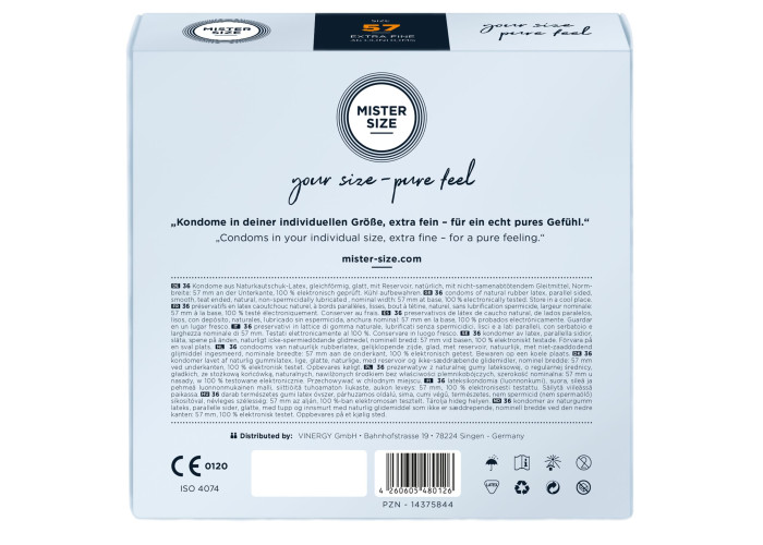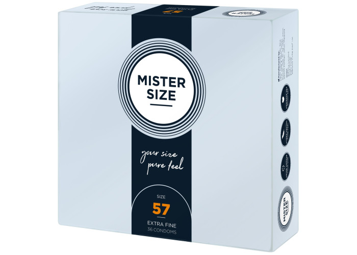 Презерватив без презерватива — лише природні відчуття під час близькості! Пропонуємо купити презервативи Mister Size - pure feel - 57, виготовлені з найтоншого каучукового латексу. Товщина стінок презерватива всього 0,05 мм, водночас він досить міцний, щоб не порватися у відповідальний момент, що забезпечує надійний захист від небажаної вагітності та ЗПСШ. Презервативи покриті силіконовою змазкою, легко надягаються та забезпечені зрозумілою ілюстрованою інструкцією. Головне, правильно дібрати розмір та насолоджуватися якісним сексом!