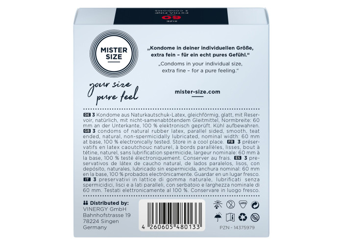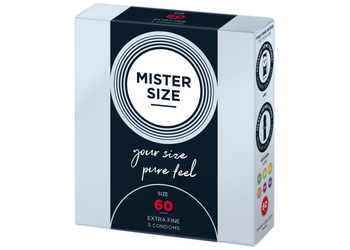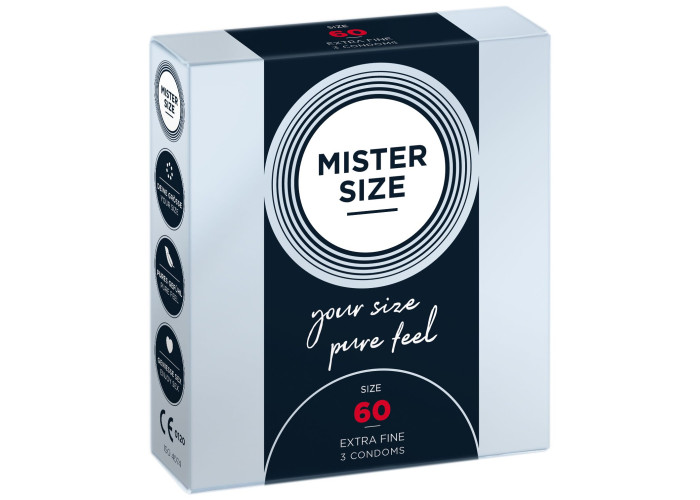 Презерватив без презерватива — лише природні відчуття під час близькості! Пропонуємо купити презервативи Mister Size - pure feel - 60, виготовлені з найтоншого каучукового латексу. Товщина стінок презерватива всього 0,05 мм, водночас він досить міцний, щоб не порватися у відповідальний момент, що забезпечує надійний захист від небажаної вагітності та ЗПСШ. Презервативи покриті силіконовою змазкою, легко надягаються та забезпечені зрозумілою ілюстрованою інструкцією. Головне, правильно дібрати розмір та насолоджуватися якісним сексом!