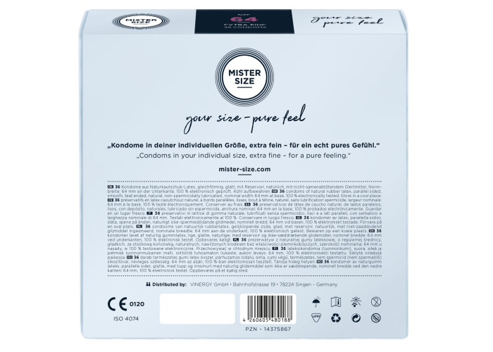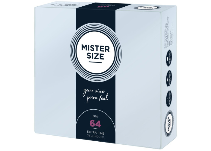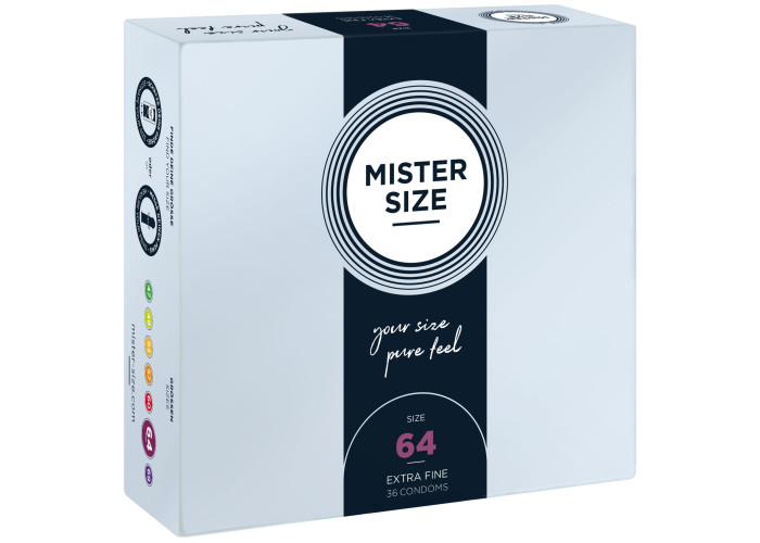 Презерватив без презерватива — лише природні відчуття під час близькості! Пропонуємо купити презервативи Mister Size - pure feel - 64, виготовлені з найтоншого каучукового латексу. Товщина стінок презерватива всього 0,05 мм, водночас він досить міцний, щоб не порватися у відповідальний момент, що забезпечує надійний захист від небажаної вагітності та ЗПСШ. Презервативи покриті силіконовою змазкою, легко надягаються та забезпечені зрозумілою ілюстрованою інструкцією. Головне, правильно дібрати розмір та насолоджуватися якісним сексом!