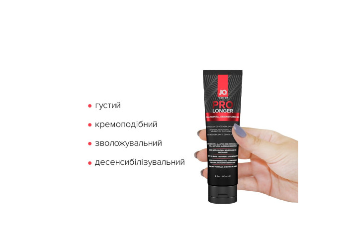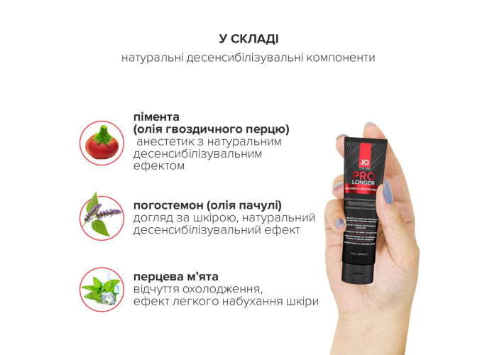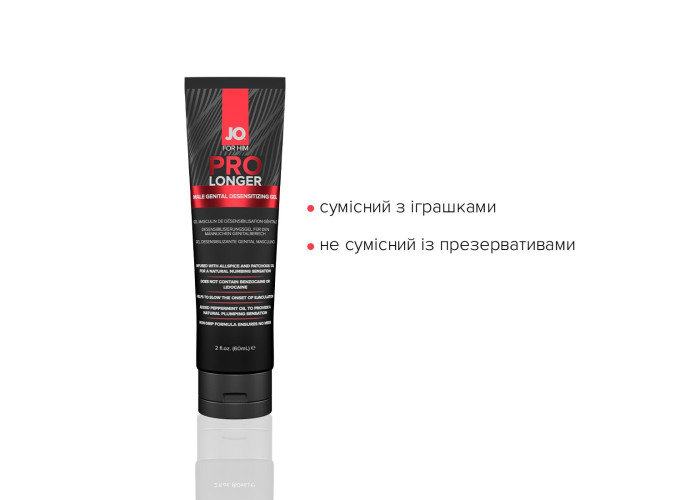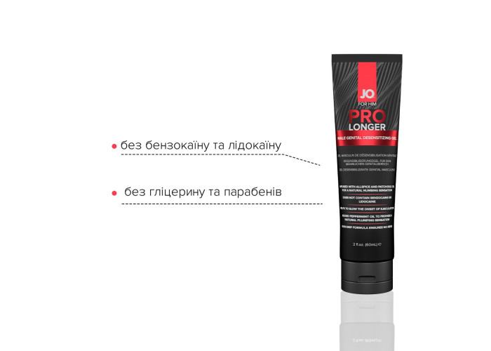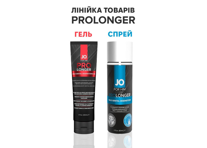 JO Prolonger Gel — спеціалізований засіб у вигляді кремоподібного густого гелю для тривалого збереження ерегованого стану члена, що сприяє уповільненню настання еякуляції. Створений із використанням натуральних десенсибілізувальних інгредієнтів. Додавання олії перцевої м’яти, гвоздикового перцю та пачулів забезпечує не лише подовження статевого акту, але й чинить ефект набухання статевого органу. Ніжна кремова текстура для приємного нанесення. Ідеально підходить для тих, хто віддає перевагу більш м’якому впливу на чутливість. У формулі лубриканту не міститься бензокаїну, лідокаїну, гліцерину та парабенів.