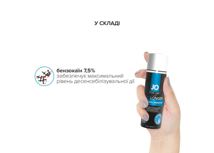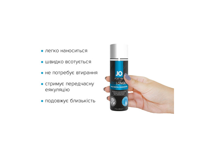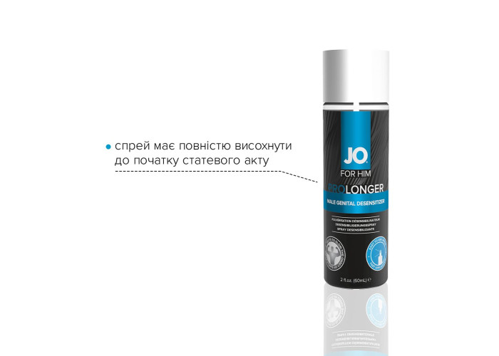 Пролонгувальний спрей JO Prolonger Spray (60 мл) — це десенсибілізувальний спрей для місцевого застосування з максимальним ступенем впливу, який спеціально розроблений, щоб уповільнити настання еякуляції та максимально збільшити вашу стійкість у ліжку. Нанесіть невелику кількість засобу на головку та стовбур статевого члена перед статевим актом, щоб досягти максимального задоволення.