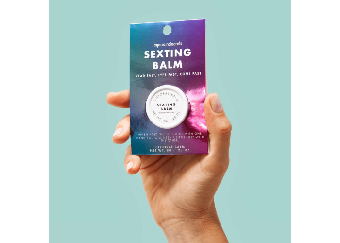 Sexting (секстинг) — листування повідомленнями та фото інтимного змісту за допомогою соцмереж та месенджерів. Ви просто пишете пікантні повідомлення, надсилає інтимні фото – і отримуєте збудливі відповіді. Що потрібно для збуджувального секстингу, що запам'ятовується? Потрібен лише хороший інтернет, уміння швидко друкувати та можливість фінішувати у потрібний момент. І з останнім вам точно допоможе бальзам для клітора Sexting Balm (Пиши, грай і запалюй): просто візьміть пальцем крапельку бальзаму і швидко, доки не розтанув, нанесіть на клітор. Розважайтеся пальцями або іграшкою, не забуваючи повідомляти партнеру, як наростає збудження і ви нестиметеся назустріч оргазму! І, звичайно, цей бальзам стане вам у нагоді і на інтимному побаченні, адже його пальці теж можуть вас порадувати.