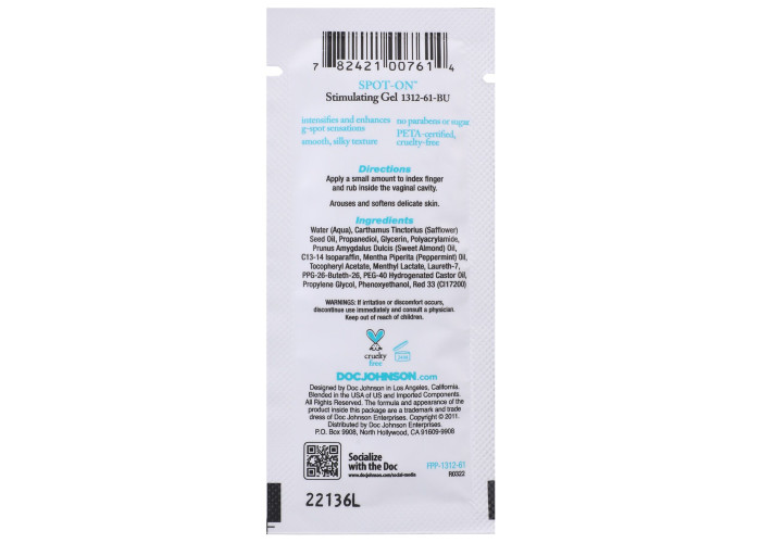 Стимулюючий гель для точки G Doc Johnson Spot On G-Spot Stimulating Gel For Women абсолютно безпечний для здоров'я. Він не містить парабенів, барвників і консервантів. Не має смаку і запаху. Не тестується на тваринах, сертифікований PETA. Зроблено в США.