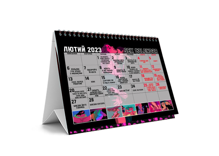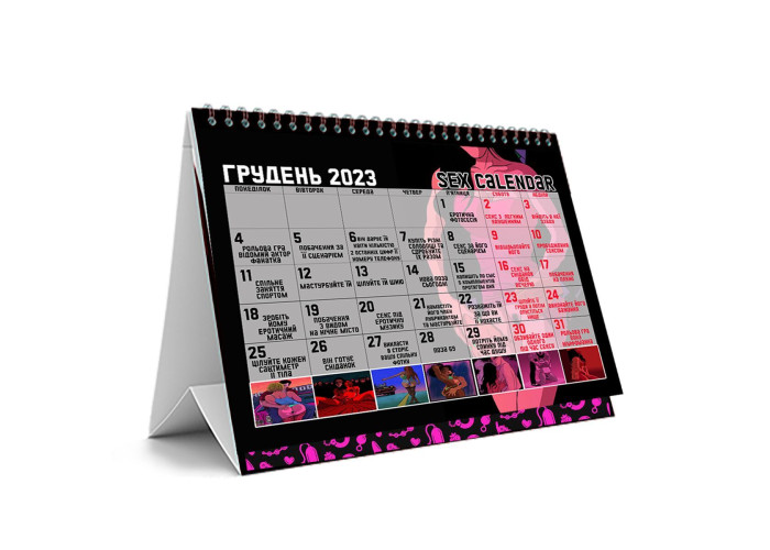СЕКС-КАЛЕНДАР 2023 — це спосіб додати пристрасну родзинку в кожен день місяця. Такий календар — ідеальний помічник для тих, хто шукає натхнення в спальні або нову можливість для пізнання партнера, його таємних бажань і фантазій.