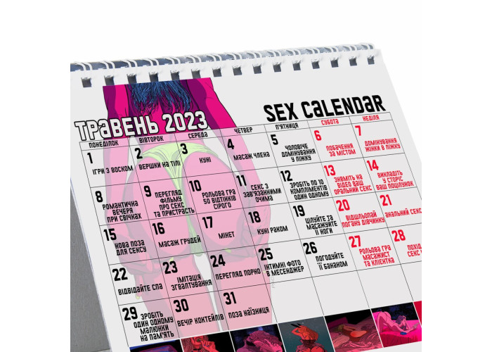З SEX-КАЛЕНДАРЕМ 2023 ви можете легко привносити щось несподіване в кожен день вашого інтимного життя. Просто подивіться яке сьогодні число, і ви дізнаєтеся, що чекає в цей день на вашу пару: рольова гра «Масажист та гаряча клієнтка», оральний секс, поза «69», побачення за містом, перегляд романтичного фільму, повторити ваше перше побачення.